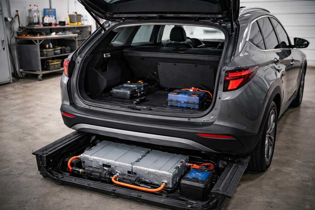 La première est la batterie 12V. Elle fonctionne comme sur un véhicule classique. Elle alimente les équipements électriques : éclairage, tableau de bord, verrouillage centralisé, multimédia et mise sous tension du système. Si cette batterie est déchargée, le véhicule peut refuser de démarrer, même si la partie hybride fonctionne parfaitement. C’est souvent elle qui est responsable d’un démarrage impossible.